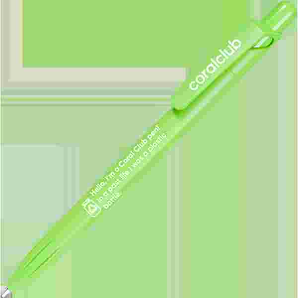 Penna a sfera con meccanismo a pulsante realizzata in materiale PET-RECYCLED con la scritta "Ciao, sono una penna Coral Club! Nella vita precedente sono stata una lattina di plastica".